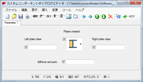 Tekla Structures により、定義した各カスタム コンポーネントのダイアログ ボックスが自動的に作成されます。 各カスタム コンポーネントには、カスタム コンポーネントのダイアログ ボックスの内容を定義する入力 (.inp) ファイルがあります。 カスタム コンポーネント ダイアログ エディター ツールを使用して、ダイアログ ボックスをカスタマイズできます。