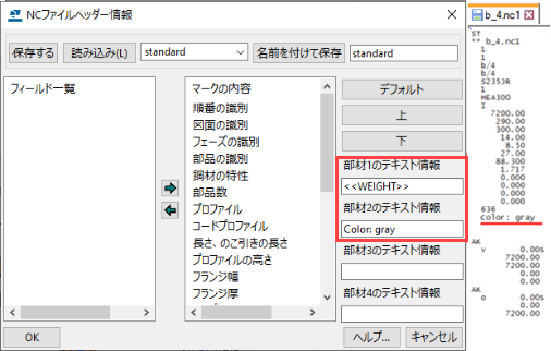 [項目] リストでは、ハード スタンプに含める項目と、ハード スタンプに項目を表示する順序を指定します。[テキスト高さ] と [文字変換] を指定することもできます。 プロジェクト番号:ハード スタンプにプロジェクト番号を追加します。 ロット番号:ハード スタンプにロット番号を追加します。 フェーズ:ハード スタンプにフェーズ番号を追加します。 部材マーク:部材の頭マークと位置番号。 製品マーク:製品の頭マークと位置番号。 材質:部材の材質。 仕上げ:仕上げのタイプ。 ユーザー定義情報:マークにユーザー定義情報 (ユーザー フィールド 1~4) を追加します。 テキスト:ハード スタンプにユーザー定義のテキストを追加できるダイアログ ボックスを開きます。 ハード スタンプに部材マークや製品マークを含めると、次のように NC ファイル名に反映されます。