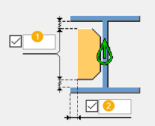溶接スカラップの寸法とウェブ プレートを定義するには、 [溶接開先] タブを使用します。フランジの溶接および溶接開先は、フランジ プレートが存在しない場合にのみ作成されます。厚さをゼロに設定すると、フランジプレートは作成されません。