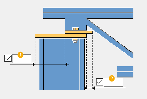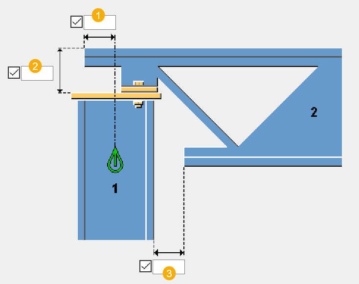 内側の角処理は、ラインの角処理として作成されます。 1 垂直方向の角処理寸法 2 水平方向の角処理寸法 |