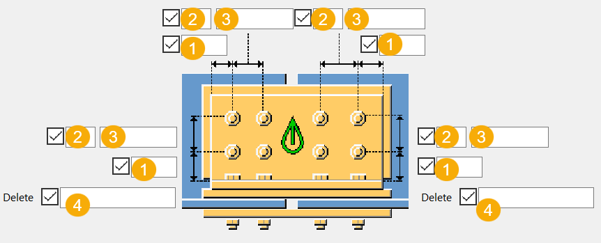 ボルト グループから削除するボルトを指定します。 削除するボルトの番号を入力します。複数のボルト番号を入力する場合は、スペースで区切ります。ボルトには、左から右、上から下の順に番号が付与されています。 |
