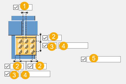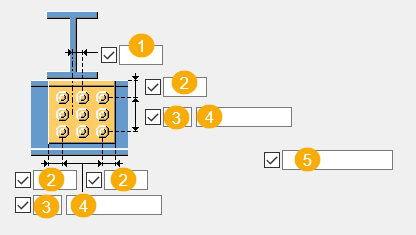 ボルト間隔。 ボルト間隔の値はスペースを使用して区切ります。ボルト個々の間隔を示す値を入力します。たとえば、3 つのボルトがある場合は、2 つの間隔値を入力します。 |