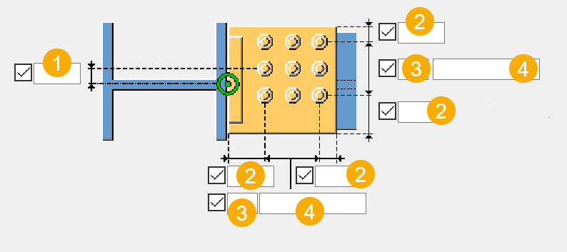 ボルト間隔。 ボルト間隔の値はスペースを使用して区切ります。ボルト個々の間隔を示す値を入力します。たとえば、3 つのボルトがある場合は、2 つの間隔値を入力します。 |