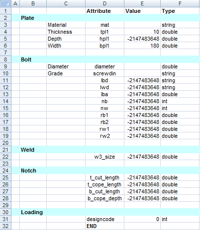 ..\Tekla Structures\<version>\Environments\common\exceldesign にある component_template.xls ファイルを使用してジョイント タイプ用の Excel スプレッドシートを作成するか、事前定義されたファイルを使用することができます。