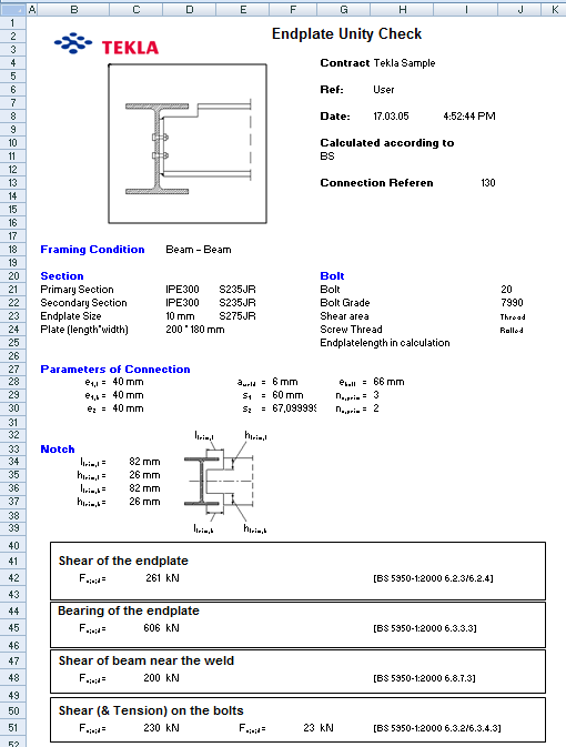 この例のイメージは、[エンド プレート (144)] ジョイントに使用される Excel スプレッドシートの例を示しています。