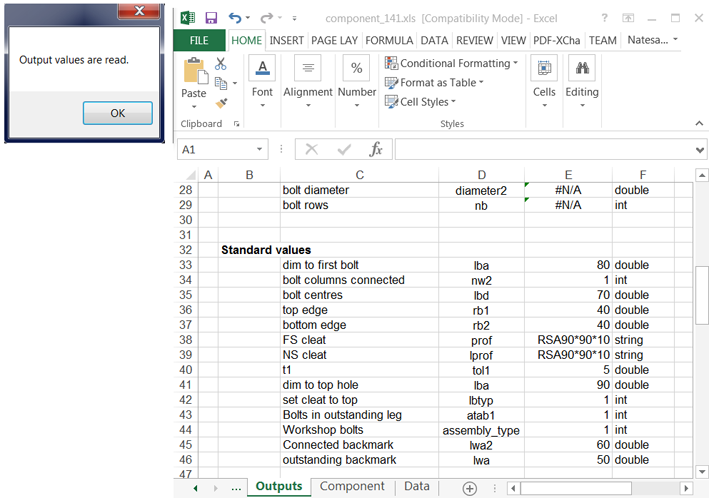 [Outputs] シートには、設計結果が含まれています。これらの値はコンポーネントに転送されます。モデル内のジョイントは、これらの値に従って変更されます。