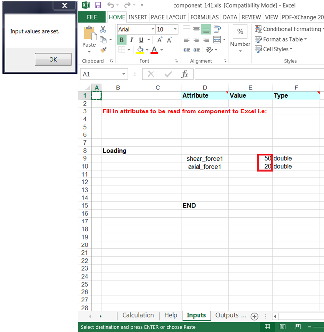 [Inputs] シートには、ジョイント ダイアログ ボックスからのジョイントのプロパティが含まれています。
