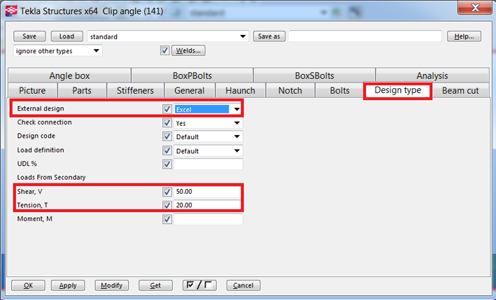 ジョイント ダイアログ ボックスに [設計] タブまたは [設計] タブがあるすべての鉄骨ジョイントのジョイント設計で Excel スプレッドシートを使用できます。