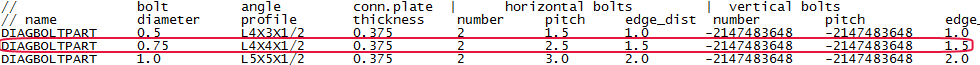 DIAGDEFDIM 行に、ボルトと部材の付加的なデフォルト プロパティを入力します。すべての斜材ジョイントですべてのプロパティが使用されるわけではありません。