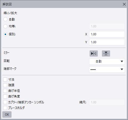 解説図を垂直または水平にミラーリングします。ミラーリングするには、ミラーリングのボタンをクリックします。