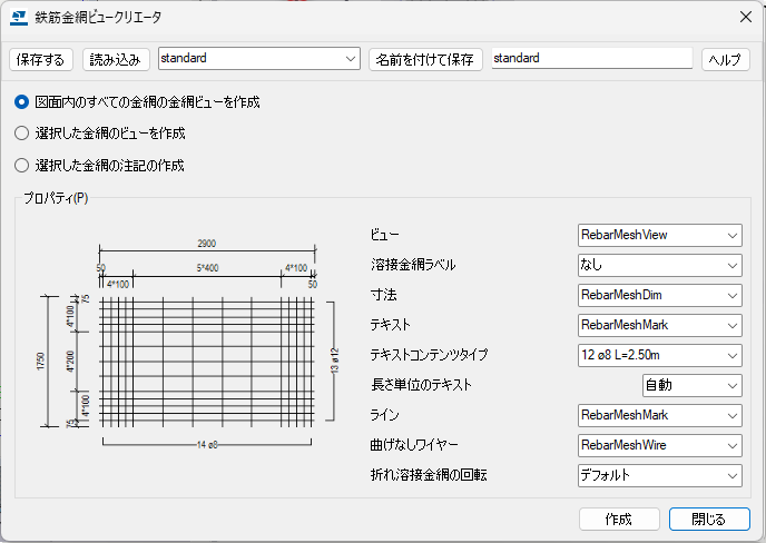 新しい溶接金網ビューで使用するビュー、寸法、テキスト、線、曲げなしワイヤーのプロパティ ファイルを選択します。