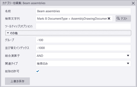 検索文字列を保存すると、よく検索する文字列を繰り返し入力する必要がなくなります。これを行うには、現在の検索を新しいカテゴリーとして保存します。既存のカテゴリーを組み合わせて、より複雑なクエリーを簡単に作成することもできます。