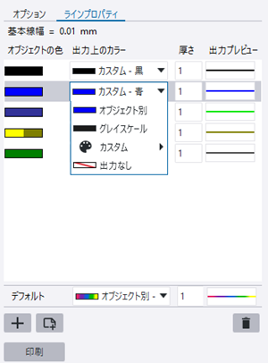 | 印刷時にデフォルトの色と線幅を使用する | デフォルト の色と線幅は、[ラインプロパティ] タブに出力定義がない図面内の色に使用されます。