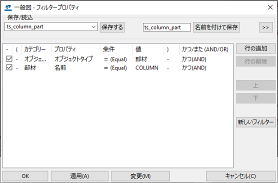 [一般図 - フィルタープロパティ] ダイアログ ボックスを開くには、[フィルター] をクリックし、柱を対象として [部材 - 名前] および [オブジェクト - オブジェクト タイプ] によるフィルターを作成し、[変更] をクリックします。