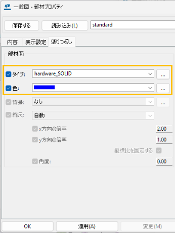 [一般図 - 部材プロパティ] ダイアログ ボックスに移動するには、[部材] をクリックして、[塗りつぶし] タブで塗りつぶしを選択し、塗りつぶし色を青色に設定したうえで、[変更] をクリックします。