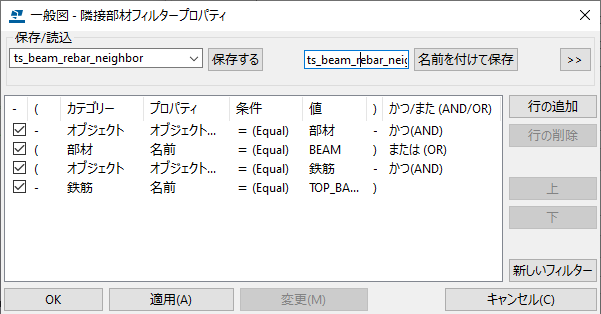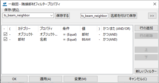[一般図 - 隣接部材フィルタープロパティ] ダイアログ ボックスを開くには、[隣接部材フィルター] をクリックし、梁を対象として [部材 - 名前] および [オブジェクト - オブジェクト タイプ] によるフィルターを作成し、[変更] をクリックします。