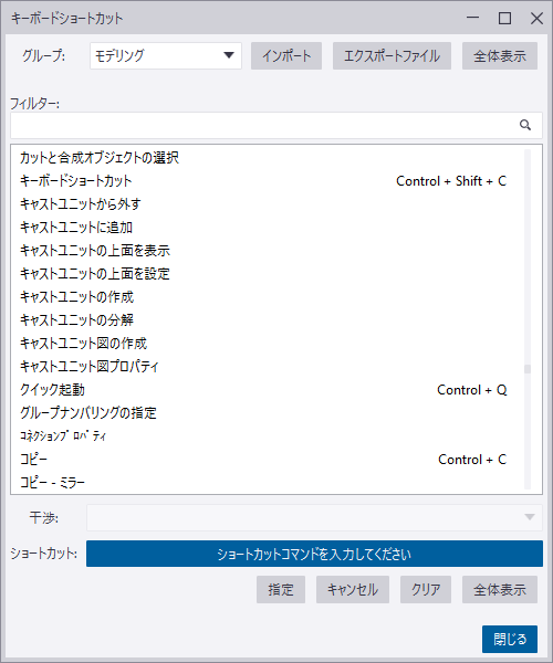 [キーボードショートカット]ダイアログ ボックスで、Tekla Structuresで利用できるすべてのショートカットのリストを表示できます。新しいキーボードショートカットを定義して、既存のものを削除することもできます。カスタマイズを完了したら、キーボードショートカットをエクスポートして、共同で作業しているメンバーと共有できます。