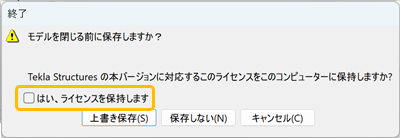 よく異なるコンピュータで Tekla Structures を使用する場合、XS_DEFAULT_KEEP_ONLINE_LICENSE_CHECKBOX 詳細設定の値を FALSE に設定することをお勧めします。こうすると、Tekla Structures を閉じたときにサブスクリプション ライセンスが自動的に予約されることはありません。