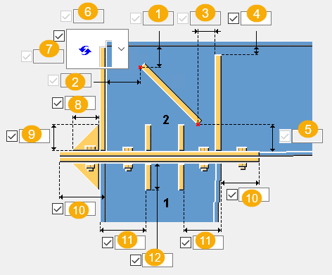 ボルト間隔。 ボルト間隔の値はスペースを使用して区切ります。ボルト個々の間隔を示す値を入力します。たとえば、3 つのボルトがある場合は、2 つの間隔値を入力します。 |