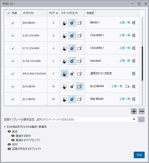 - [作成レビュー] ダイアログで、既に図面があるオブジェクトの [作成] 列にステータス アイコン