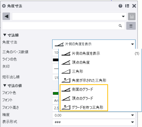 角度寸法プロパティ パネル、コンテキスト ツールバー、一般図寸法プロパティ、古い寸法プロパティ ダイアログで、新しいグラディアン オプションを使用できます。