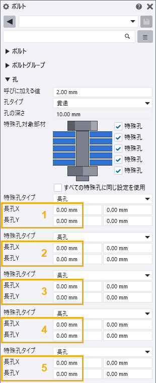 たとえば、SPECIAL_HOLE_1_X は、ボルト頭マークに最も近い最初の長部材のボルトグループのx方向の長孔の許容値を示します。SPECIAL_HOLE_5_Y は、5 つの長部材の y 方向の許容値を示します。