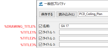 ユーザー定義情報またはテンプレート属性を入力する場合、[詳細設定] ダイアログ ボックスでそれらの前後に単一の % 文字を使用します。デフォルト値は %DRAWING_TITLE% 属性です。%TITLE% 属性でも同じ結果になります。これらの属性を使用すると、図面プロパティ ダイアログ ボックスの [名前] フィールドに入力した図面名がビュー ラベルによって取得されます。%TITLE1%、%TITLE2%、または %TITLE3% と入力した場合、ビュー ラベルにより図面プロパティの [タイトル 1 - タイトル 3] フィールドからテキストが取得されます。形式 %DR_TITLE1%、%DR_TITLE2%、%DR_TITLE3% を使用しても同じ結果になります。