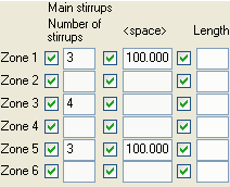 分布には6つのゾーンを定義できます。ゾーンごとに、あばら筋の数を設定できます。あばら筋間の距離は、次の 2 つの方法で定義できます。