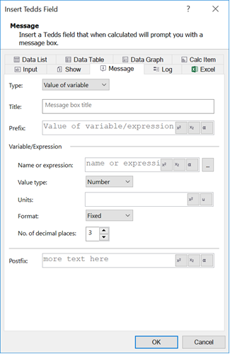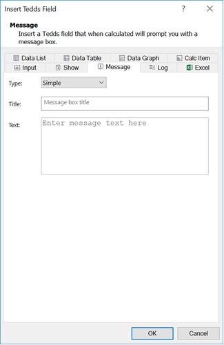 Message fields display a message box that gives the user information as the calculations are performed. To create different types of Message fields, see the following instructions.