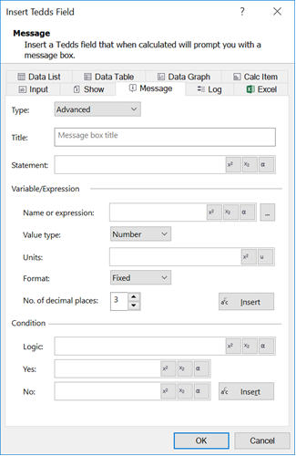 You can create Advanced fields using two different approaches. You can either type directly in the Statement field or use Insert buttons to add variable and condition details in the Statement field. Tedds for Word then evaluates the Statement field to create the Advanced field.