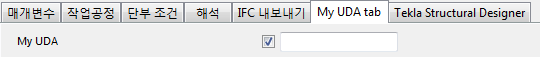 /***************************************************************************/ /* User-defined attributes */ /***************************************************************************/ part(0,"Part") { /* Common tab pages for part attributes */ tab_page("My UDA tab") { unique_attribute("MY UDA", "My UDA", string,"%s", no, none, "0,0", "0,0") { value("", 0) } } tab_page("My UDA tab", "My UDA tab", 19) modify (1) } /***************************************************************************/ /* Column attributes */ /***************************************************************************/ column(0,"j_column") { tab_page("My UDA tab", "My UDA tab", 19) modify (1) }이로써 사용자 정의 속성은 고유성을 갖게 되어 사용자 정의 속성 값을 다른 부재에 복사할 수 없습니다.