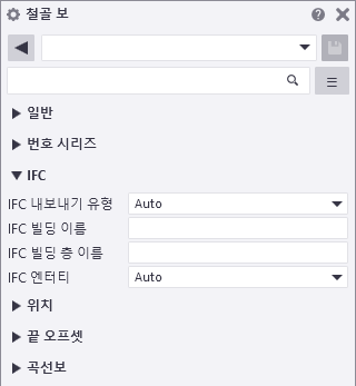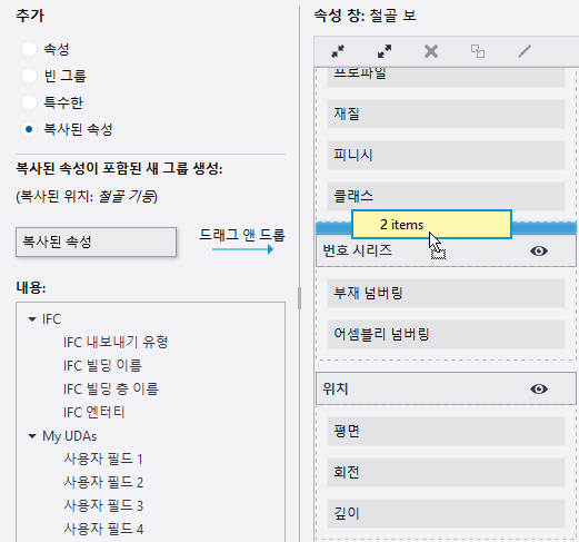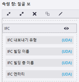 이 예시는 IFC 관련 사용자 정의 속성(UDA) 그룹을 철골 기둥 속성 창 레이아웃에 추가하고 그룹을 철골 보 속성 창 레이아웃에 복사하는 방법을 보여주고 있습니다.