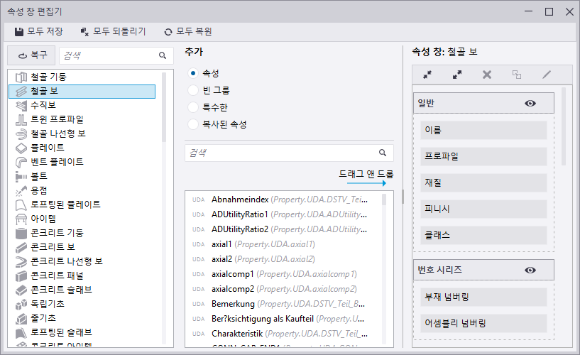 중간의 속성 목록. 목록에는 각 모델 객체 또는 도면 객체에 사용할 수 있는 모든 속성이 표시됩니다. 모델 객체의 경우에는 각 객체 유형에 대한 사용자 정의 속성(UDA)도 표시됩니다. 이러한 속성과 UDA를 일반 속성으로 속성 창 레이아웃에 추가할 수 있습니다. 이미 사용 중인 속성은 다시 추가할 수 없지만 속성 창 레이아웃에서 다시 구성할 수 있습니다. 선택한 객체 유형과 호환되지 않는 속성은 추가할 수 없습니다.