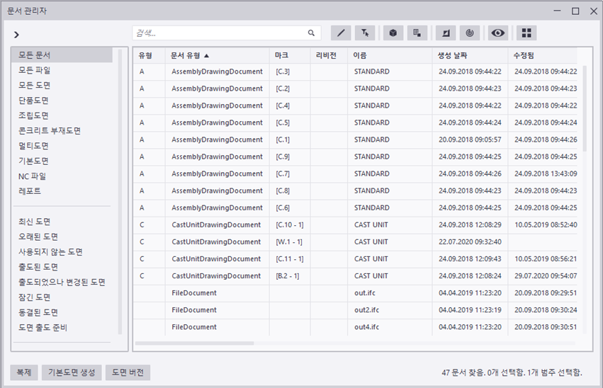 모델에서 도면과 파일 문서를 포함한 모든 문서 나열 |