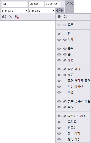 모델 및 컴포넌트의 객체 가시성을 빠르게 수정하려면 상황에 맞는 도구 모음을 사용합니다. 뷰를 클릭하고 상황에 맞는 도구 모음의 눈 아이콘을 사용하여 가시성을 설정합니다.