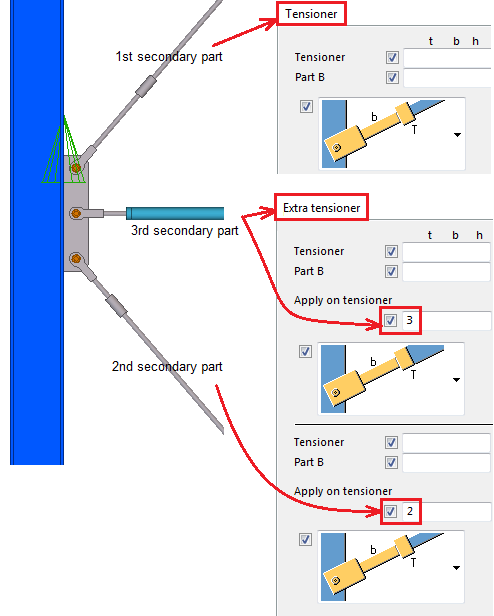 Tensioner 탭에서 브레이스가 1개인 경우 인장재를 정의합니다. 브레이스이 다수인 경우 추가 인장재 탭에서 두 번째, 세 번째 등의 브레이스 인장재를 정의합니다. 인장재 번호에 적용 상자에서 브레이스 번호를 정의합니다.