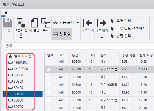 철근 카탈로그에서는 철근 정의가 그룹으로 정렬됩니다. 그룹을 추가, 복사, 수정 및 삭제하고, 다른 속성에 따라 그룹을 정렬할 수 있습니다.