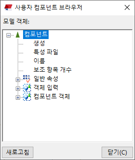 사용자 컴포넌트 브라우저는 사용자 컴포넌트의 내용을 계층적인 트리 형태의 구조로 표시합니다. 사용자 컴포넌트 브라우저는 사용자 컴포넌트에 첨부할 모델 객체와 사용자 컴포넌트가 생성하는 객체를 나열합니다. 사용자 컴포넌트 변수와 컴포넌트 객체 속성 사이에 링크를 생성할 수 있습니다.