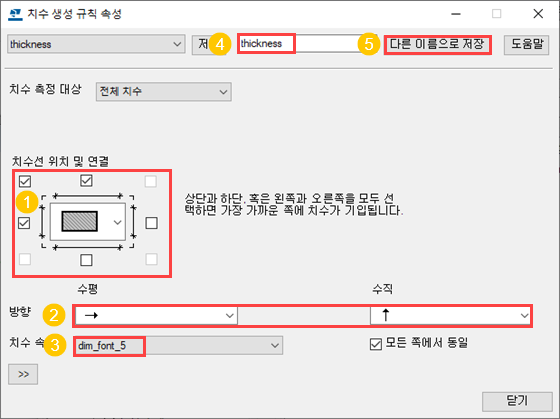 치수 생성 패널의 속성 열에서 전체 치수 생성 규칙의 속성 파일로 thickness를 선택합니다.