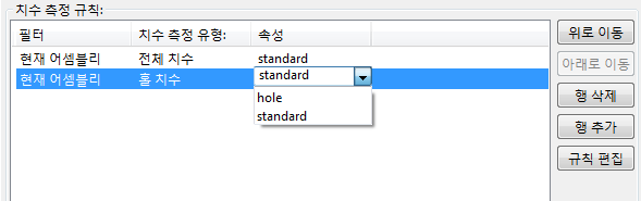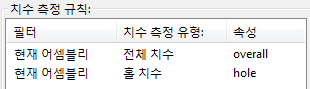 전체 치수 규칙의 경우 overall 속성을 선택하고, 홀 치수 규칙의 경우 속성 열에서 hole 속성을 선택합니다.