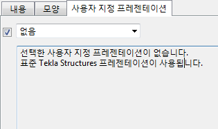 객체 유형에 대한 사용자 지정 프레젠테이션을 다운로드하면 해당 객체의 도면 속성 대화 상자에서 사용자 지정 프레젠테이션 탭을 사용할 수 있게 됩니다. 목록에는 특정 객체 유형(부재, 용접, 마크 등)에 사용할 수 있는 사용자 지정 프레젠테이션만 표시됩니다.