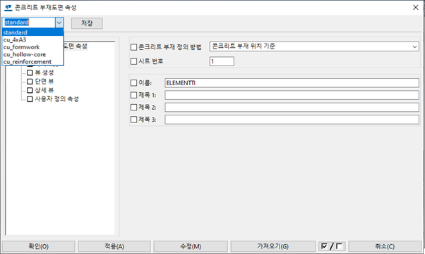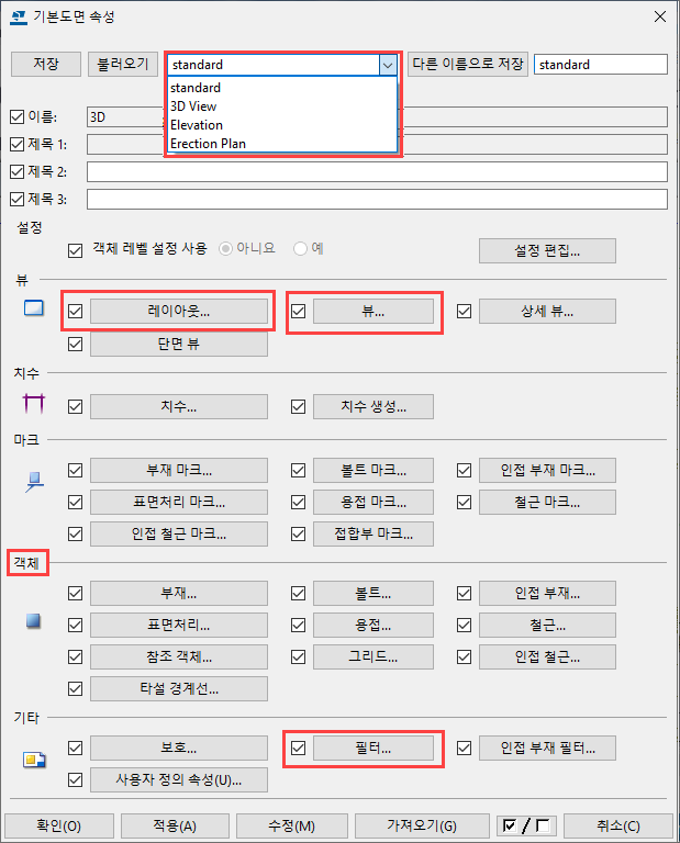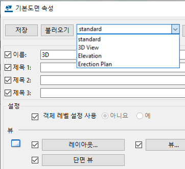 다음은 기본도면의 도면 설정 목록의 예입니다.