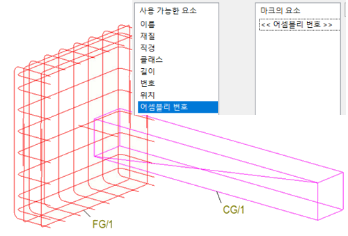 철근 마크 및 연결 메모 속성에서 어셈블리 번호 요소를 사용할 수 있습니다. 이는 연결된 어셈블리의 번호를 부여합니다.