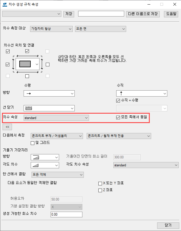 통합 치수를 선택하면 치수 생성 속성 대화 상자가 표시됩니다. 탭의 설정을 변경하고 다른 이름으로 저장을 사용하여 고유한 이름으로 속성 파일을 저장합니다. 여기서도 치수 속성을 로드할 수 있습니다.