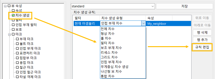 치수 생성 패널에서 행 추가를 클릭하여 규칙을 추가할 수 있습니다. 그런 다음 치수 생성 유형 열과 원하는 치수 생성 규칙 속성 파일에서 사용할 치수 생성 규칙을 선택합니다.