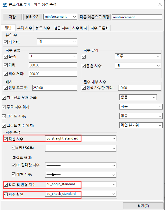 - 치수 생성 규칙에 맞는 치수 속성 파일을 선택했는지 확인합니다.