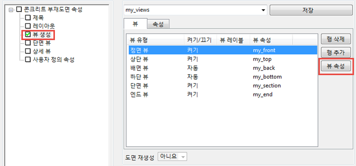 - 도면 속성의 옵션 트리에서 뷰 생성 옵션을 클릭하면 생성할 뷰와 사용할 뷰 속성을 선택할 수 있습니다.