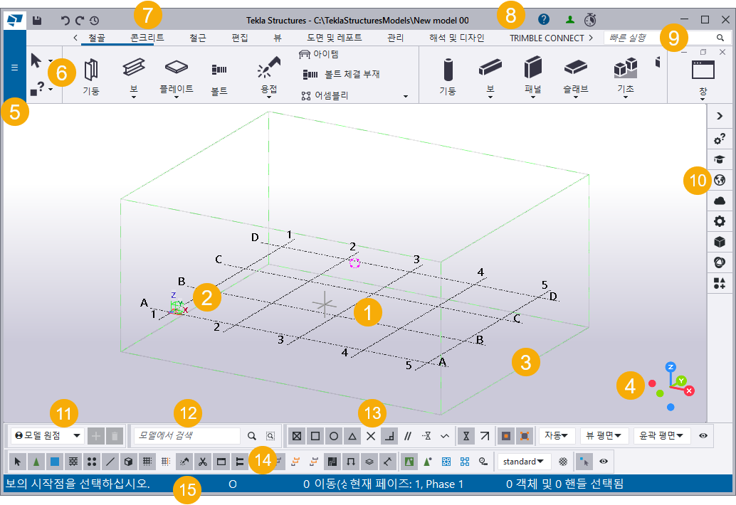 (1) 사용자의 Tekla Structures 모델입니다. 완전히 새로운 프로젝트를 시작할 경우, 이 시점에서는 기본 모델 뷰와 빈 그리드만 보일 것입니다.