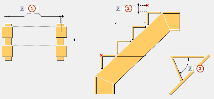 연속되는 두 계단 사이에 허용되는 최대 거리를 정의합니다. 계단 사이의 간격은 계단 간격 유형 정확함 또는 같음 및 계단 개수를 사용하여 계산합니다. 예를 들어 계단 높이가 200mm이어야 하는 경우 정확함으로 설정하면 정확히 이 높이의 계단이 생성됩니다(계단 개수를 정수로 입력). 같음으로 설정하면 높이가 200mm와 가능한 가깝게 계산되어 하단부터 상단까지 필요한 계단 개수가 생성됩니다 |