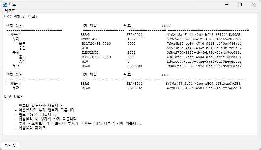선택한 두 부재 또는 어셈블리를 비교하여 예를 들어 동일한 위치 번호를 가져왔는지 확인할 수 있습니다.